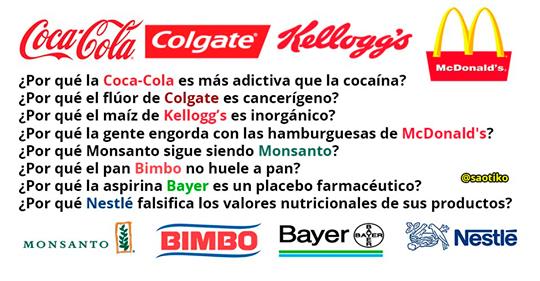 Hoy en día, las transnacionales se burlan de los tontos consumidores, afirmando que sus venenos son legales, ligeros, artesanales, integrales y naturales. También se están empleando falsas iconografías ecológicas, en las etiquetas frontales y dorsales de los productos, para que la gente piense que la enfermedad es una fuente de respeto ambiental, y no se preocupen por los altos niveles de colesterol, por la agitada presión arterial, y por el implacable osteosarcoma.